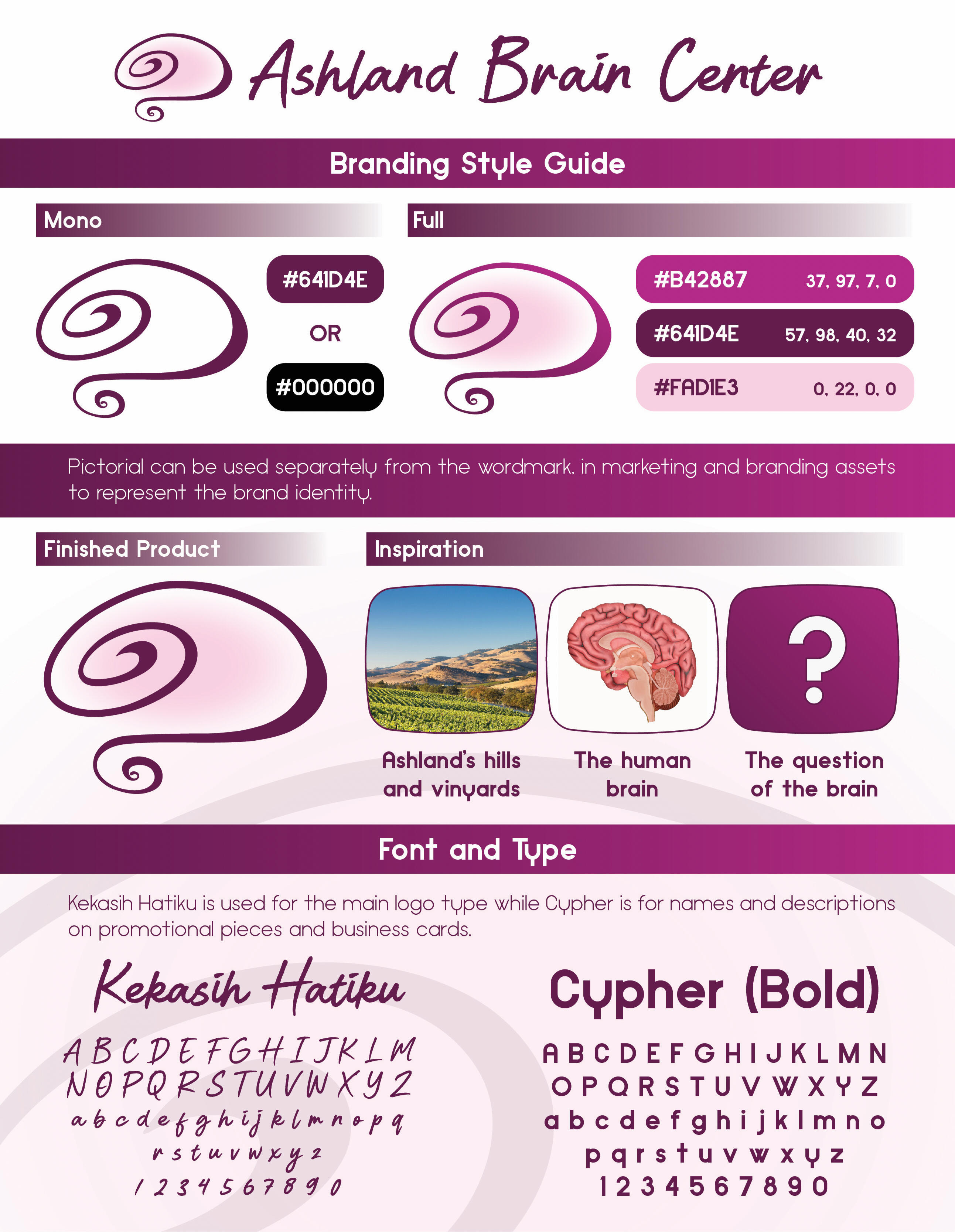 Ashland is a part of who I am, and I was grateful for the chance to help the Ashland Brain Center bring their logo forward. They felt the current design was a little bland. I wanted to envision something more in line with the local area.Creating the logo, I kept in mind the idea that this is a uniquely Ashland business. Drawing inspiration from the local scenery, the logo is meant to evoke two images; the first being the surrounding mountains with its paths, trails, and vineyards, and the second is our brain.